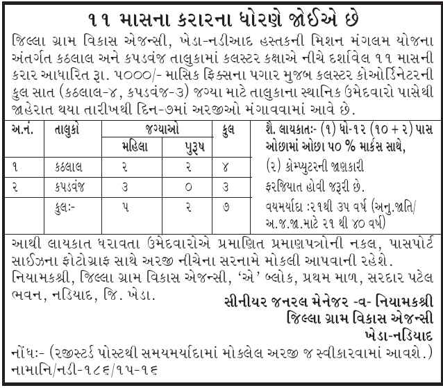 Send your application at here: Director, District Rural Development Agency, A - Block, First Floor, Sardar Patel Bhavan, Nadiad, Di. Kheda.
